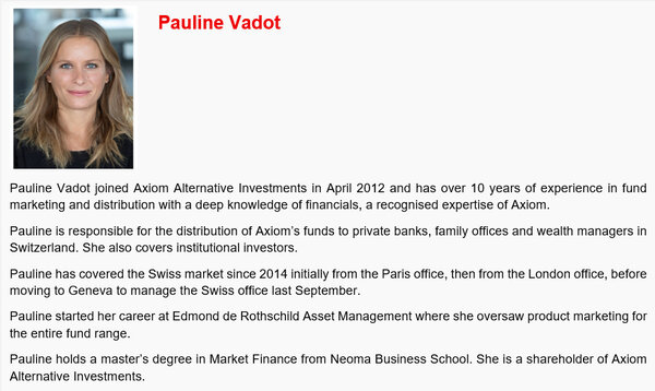 The new sales office will be led by Pauline Vadot who has more than 10 years’ experience at Axiom Alternative Investments, including 8 years covering Switzerland.