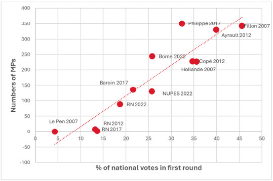 French parliamentary elections do not work with a first-past-the post system but with what are effectively 579 two-round elections. This means that local alliances and political history play a large role in the outcome. It is very hard to translate a share of national votes into number of MPs and the relationship is not linear as the chart below shows.