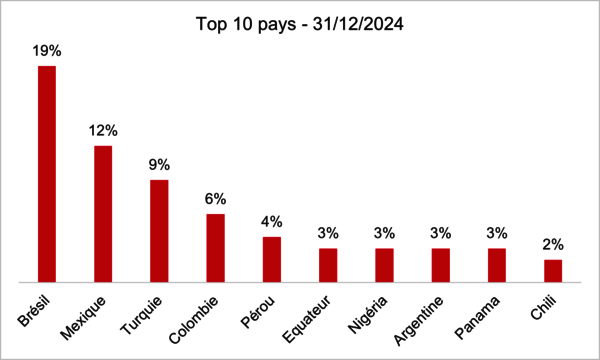 En termes d'exposition géographique, nous continuons de privilégier l'Amérique latine (55% du fonds), car nous considérons que la région offre l'opportunité rendement/risque la plus attractive compte tenu des valorisations actuelles du marché et de nos perspectives sur les fondamentaux.