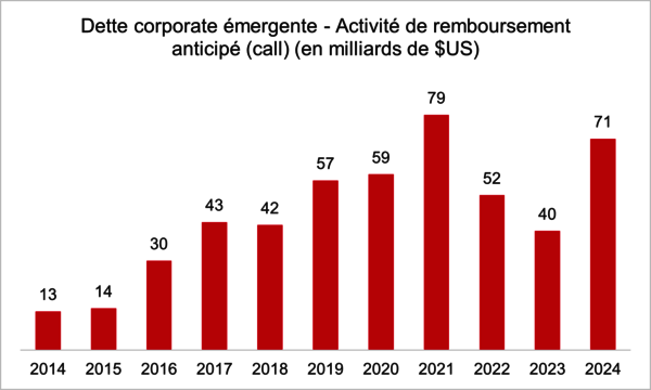 En effet, 2024 a été la deuxième année la plus élevée en termes de volumes de calls pour les entreprises des marchés émergents au cours des 11 dernières années, avec 71 milliards de dollars d'obligations callées. Nous estimons qu'avec les échéances qui se profilent en 2026-2027 et les niveaux actuels de spreads, l'activité primaire sera assez importante début 2025 et que les volumes d'obligations callées devraient rester solides.