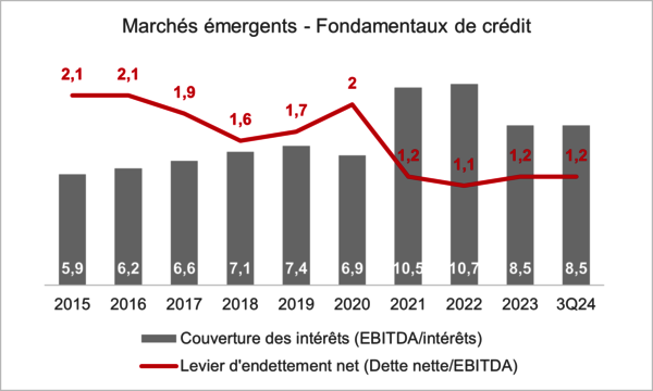En effet, le spread des obligations HY des marchés émergents reste environ 65 pdb au-dessus de ses plus bas de 2018, alors même que les fondamentaux du crédit des entreprises des marchés émergents se sont nettement améliorés depuis. En décembre 2024, les spreads du segment HY émergent étaient également plus élevés que ceux des obligations HY américaines (+76 pdb) et européennes (+17 pdb).
