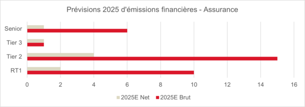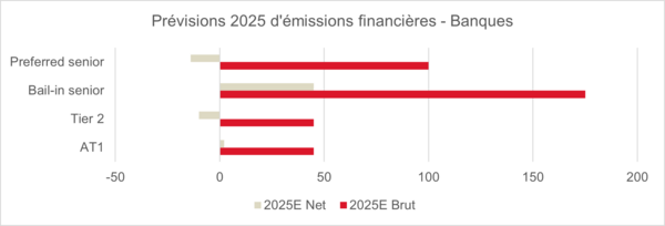 Concernant l’offre d’instruments, la dynamique 2025 devrait être favorable, avec une offre nette négative attendue pour les Tier 2 et une offre légèrement positive pour les AT1 dans un contexte de flux entrants continus dans les fonds obligataires, à mesure que les taux à court terme baissent.