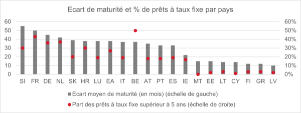 Les banques ont généralement un écart de maturité positif, ce qui signifie que l’actif prend plus de temps à être réajusté par rapport au passif. Cet écart varie significativement selon le type d’institution et le pays, ce qui entraîne des dynamiques de marges nettes d’intérêt très différentes lorsque les taux d’intérêt évoluent.
