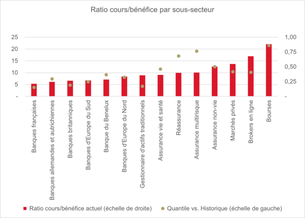 Les banques françaises et allemandes figurent en effet parmi les banques avec les plus faibles ratios cours/bénéfices, malgré leur sensibilité limitée au niveau des taux.