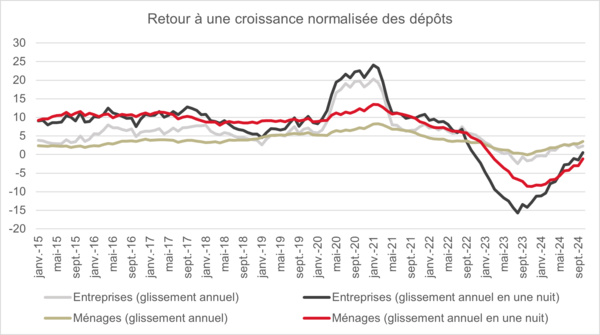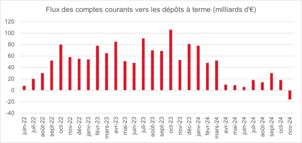 Un autre facteur pertinent est le reverse beta, c’est-à-dire la capacité des banques à répercuter les baisses de taux sur les dépôts. Les premiers signes sont encourageants. Les taux des dépôts à terme ont déjà significativement diminué depuis le pic atteint fin 2023, à une vitesse d’environ 6-7 points de base par mois. En outre, les clients ne déplacent plus leurs fonds hors des comptes courants, comme le démontre le graphique ci-dessous.