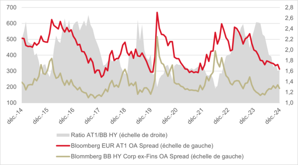 En termes de spread, les AT1 continuent d’offrir un spread attractif par rapport aux instruments High Yield d’entreprises de même qualité de crédit. Le ratio de spread de l’indice Euro AT1 par rapport à l’indice Euro HY BB ex-Financials oscille autour de sa moyenne à long terme de 1,5x environ.