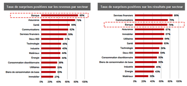 Les prévisions de bénéfices des banques européennes ont été revues à la hausse pour le 17ème trimestre consécutif ! 85% d’entre elles ont dépassés les attentes des analystes sur leur génération de revenus et 74% au niveau de leurs résultats.