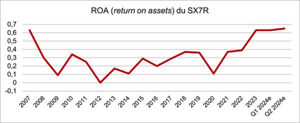 Des banques assagies n’ont pas été synonyme d’une moindre rentabilité, surtout avec le cycle de resserrement monétaire qui a vu les dépôts bancaires redevenir une source de profit pour les banques, après huit ans de taux négatifs. Ce nouvel environnement monétaire a propulsé la rentabilité des actifs des banques européennes aux niveaux de 2007, avec un niveau de risque beaucoup plus faible.
