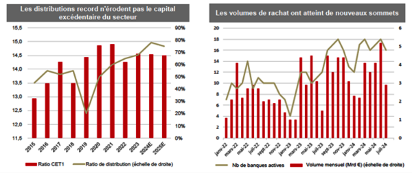 Le changement de cycle de taux, qui a suivi une décennie d’accumulation de capital excédentaire, permet donc aux banques européennes d’offrir aux investisseurs une rémunération élevée en maintenant un niveau de capital au plus haut depuis 25 ans.