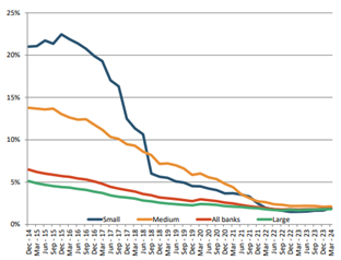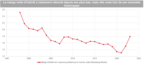 En effet, la marge nette d’intérêt (« NIM ») a nettement rebondi avec le cycle de resserrement monétaire, passant de son plus bas niveau à son niveau moyen de long terme. Mais c’est oublier un peu vite que la marge d’intérêt d’une banque est composée de la marge qu’elle réalise sur les dépôts, mais également de sa marge sur les crédits et de l’activité de transformation.